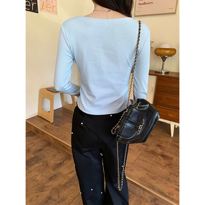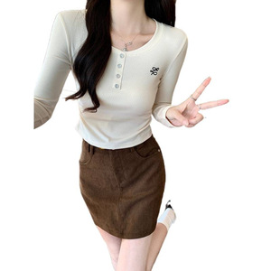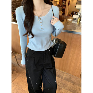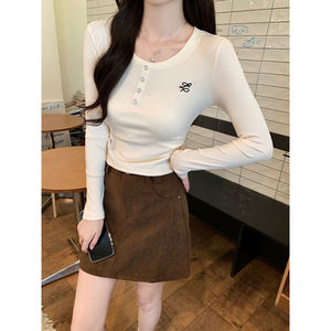 韩版圆领纽扣长袖T恤女夏季2025新款修身短款杏色打底衫套头上衣