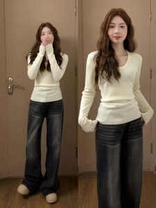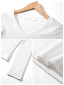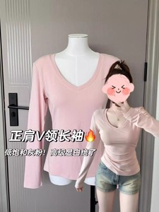 白色V领正肩长袖t恤打底衫女款初早秋收腰修身辣妹薄款内搭小上衣