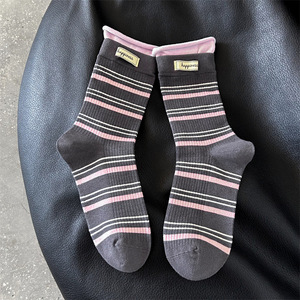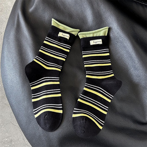 早秋氛围感ins条纹撞色中筒袜子女秋冬字母布标拼接假两件堆堆袜