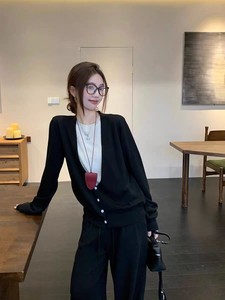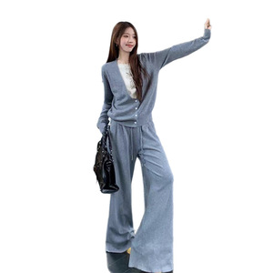 韩国chic休闲套装V领假两件长袖毛衣女2025秋高腰阔腿裤两件套女