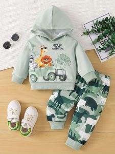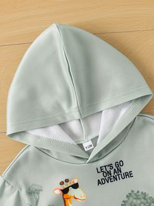 跨境ins婴幼小童男宝宝春秋款抓绒连帽卡通动物印花长袖上衣长裤