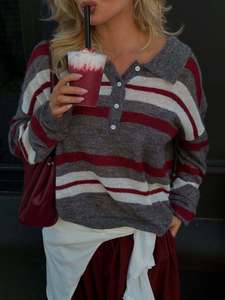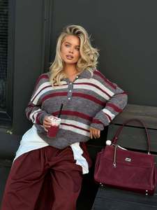 美式复古街头宽条纹polo领套头毛衣女秋冬内搭撞色百搭针织衫批发