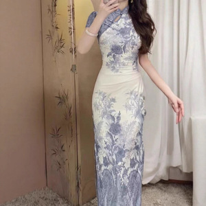 9145#新中式国风复古印花改良旗袍女蓝色收腰连衣裙