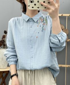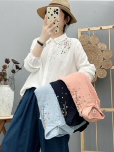 6827清新小花刺绣透气棉纱长袖衬衫 女2025春秋新款宽松显瘦衬衣