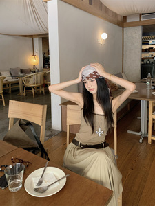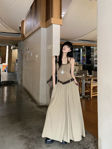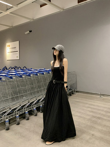 新款撞色设计感收腰显瘦辣妹假两件吊带连衣裙带胸垫长裙子女