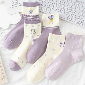 新款花边中筒袜女秋季袜子女秋冬季韩系蝴蝶结刺绣长筒袜甜美吸汗