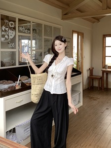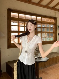 法式复古荷叶边短袖衬衣女夏季白色小众别致收腰显瘦气质衬衫上衣