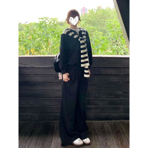2025韩版学院风条纹披肩黑色运动卫衣休闲裤长裤三件套女早秋穿搭