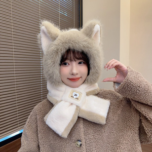 新品狐狸耳朵帽围巾一体帽女款冬季加厚保暖护耳帽时尚百搭帽子