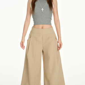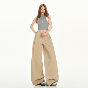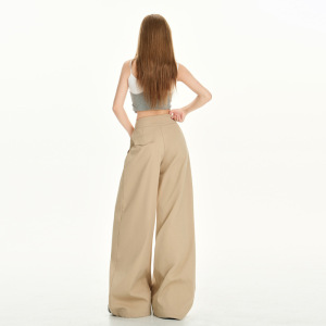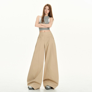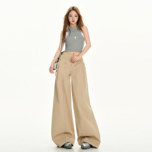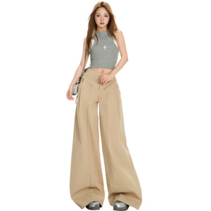 尚雅8080款慵懒风设计卡其色休闲裤女夏季高腰宽松阔腿裤拖地长裤