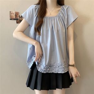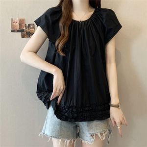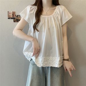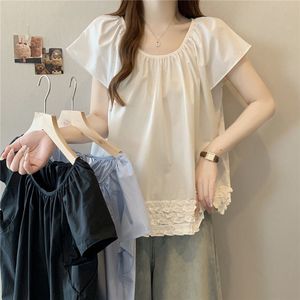 大码设计感木耳边花边短袖t恤女夏季新款宽松显瘦遮肉拼接上衣女