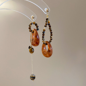 银针虎眼石流苏不对称耳环设计感小众气质耳钉复古民族风百搭耳饰