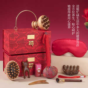 养生大礼包八红礼盒【艾草按摩捶+眼罩+猫咪按摩梳+经络刷+痒痒挠+玫瑰精油*2+穴位图】免费代写贺卡