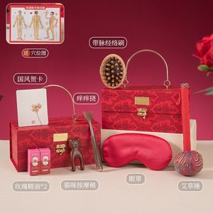 养生大礼包一红礼盒【艾草按摩捶+眼罩+猫咪按摩梳+经络刷+玫瑰精油*2+穴位图】免费代写贺卡