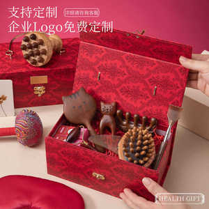 养生大礼包四红礼盒【艾草按摩捶+眼罩+猫咪按摩梳+刮痧板+玫瑰精油*2+穴位图】免费代写贺卡