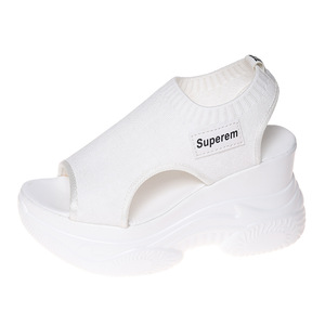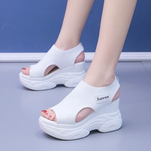 流行夏季新款针织鱼嘴鞋仙女风松糕底高跟飞织坡跟厚底运动女凉鞋