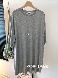 韩版女装麻感棉毛边宽松中长款夏季薄款纯色复古T恤连衣裙短袖ins