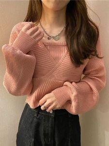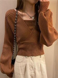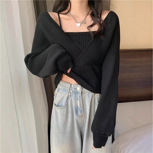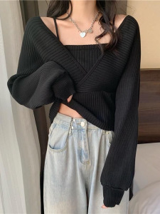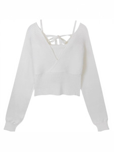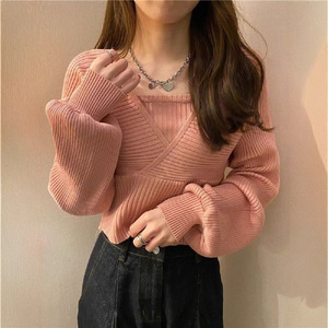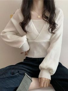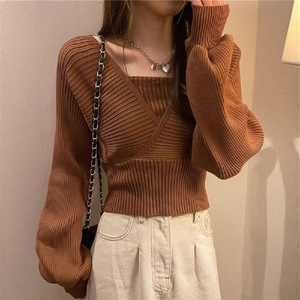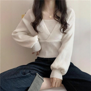白色方领假两件针织打底衫女秋装短款高腰毛衣小个子正肩别致上衣