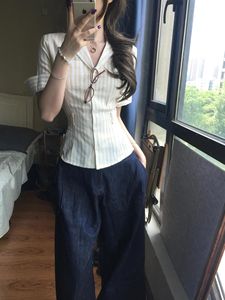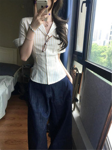 2025新款高级感v领条纹短袖衬衫女夏季气质短款衬衣法式掐腰上衣