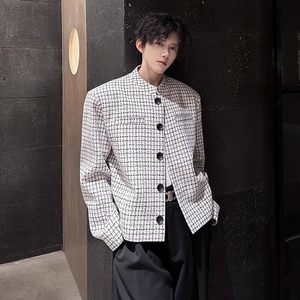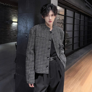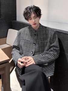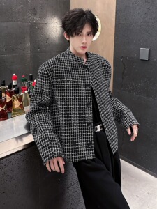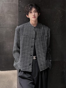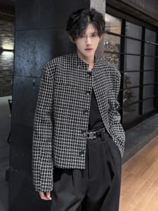男模痞帅风外套小香风千鸟格短款西装高级感酷帅穿搭立领垫肩夹克