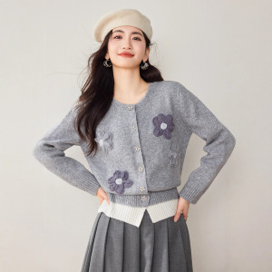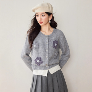 设计感立体花朵开衫毛衣外套女秋冬宽松百搭软糯撞色拼接针织上衣