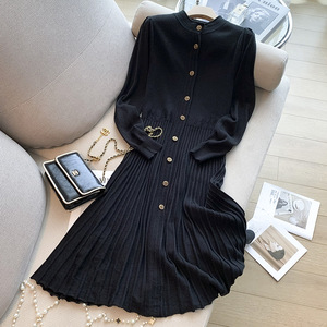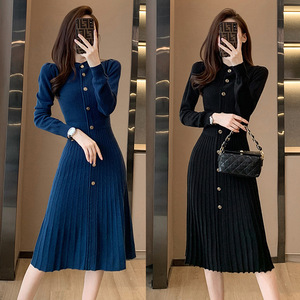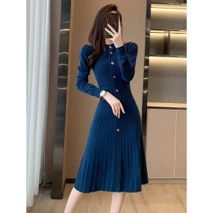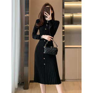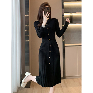 7076法式小香风修身针织连衣裙女秋季新款单排扣百搭中长款毛衣裙