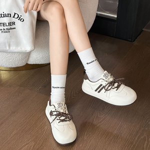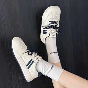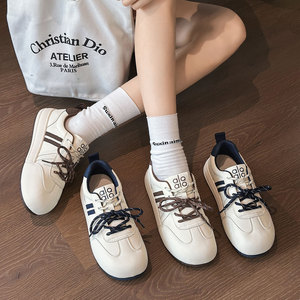 真皮厚底德训鞋女2025秋新款百搭轻便小白鞋圆头拼色系带运动板鞋