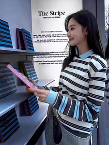 现货韩国grove车静媛同款宽松圆领套头拼色条纹长袖T恤女上衣显瘦
