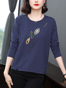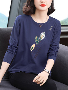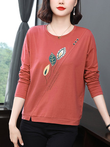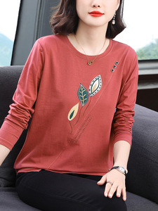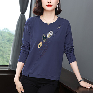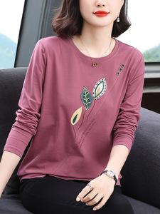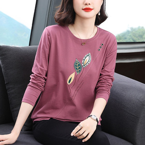 长袖t恤女秋季宽松中年妈妈新款纯棉刺绣上衣秋洋气外穿打底衫