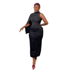 901955欧美圆领无袖外贸连衣裙牛奶丝拼接毛毛款包臀长裙女亚马逊