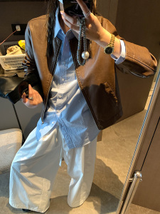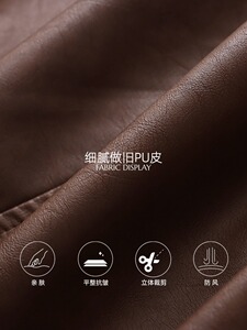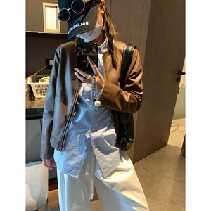 摩且 早秋新款 美式高级感做旧PU皮圆领宽松拉链皮衣外套 MQ0664