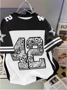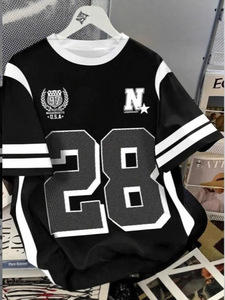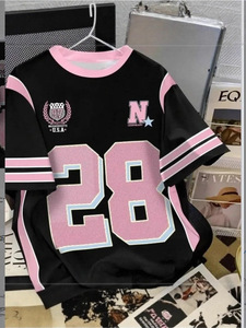2025美式高街休闲运动棒球领撞色短袖长袖t恤女夏季宽松印花半袖