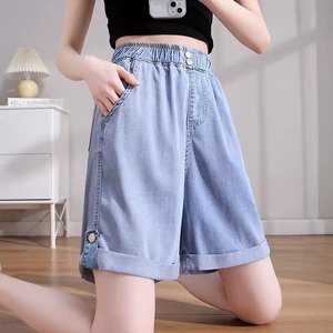 大码女冰丝牛仔短裤夏季薄款胖mm梨型身材显瘦高腰天丝五分阔腿裤