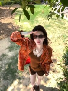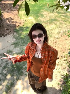 美式复古橙色宽松刺绣格子长袖衬衫开衫上衣女休闲慵懒感百搭外套