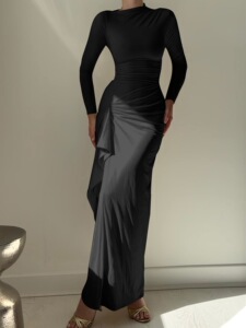 2025欧美女装跨境秋冬连衣裙纯色圆领时尚优雅开叉晚礼服包臀长裙