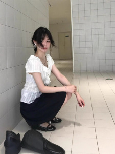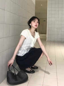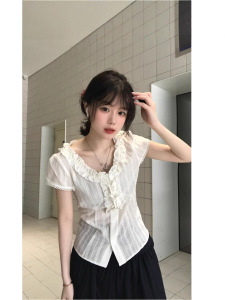 【工厂现货】法式复古荷叶边衬衫夏季蕾丝收腰显瘦短袖衬衫白色女