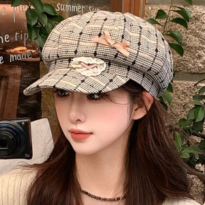 韩版秋季爱心蕾丝蝴蝶结格子贝雷帽子女甜美文艺百搭高级感画家帽