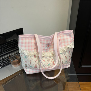 大容量新款可爱甜美格子托特包手提2025手拎少女粉色蕾丝拼接单肩