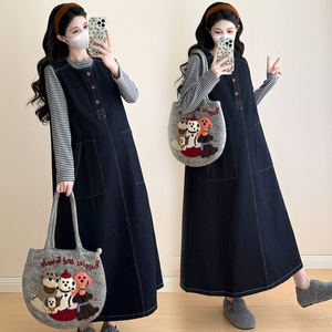 孕妇装秋季新款百搭条纹上衣+韩版宽松休闲牛仔背心裙孕妇两件套