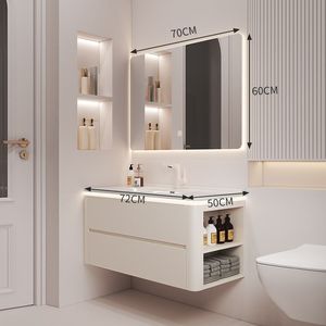 Hot升级氛围灯镜柜加大内径陶瓷盆+送货到家-70CM易清洁陶瓷一体盆+升降抽拉式水龙头