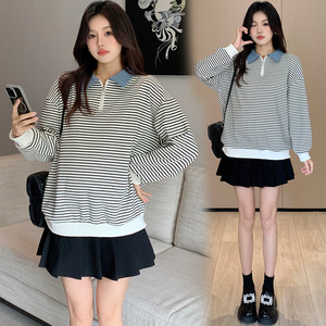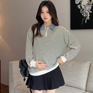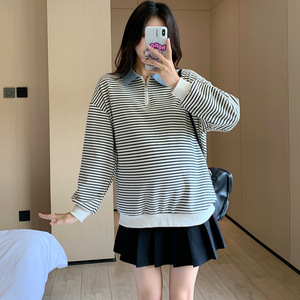 现货孕妇秋冬条纹卫衣宽松长袖大码上衣百搭圆领套头孕妇卫衣