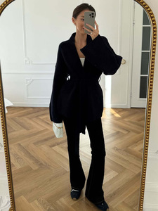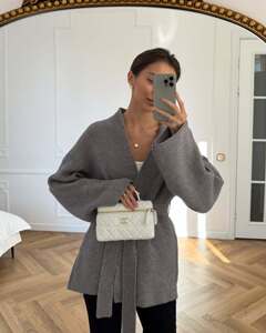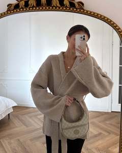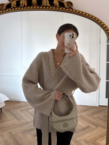 法式宽松慵懒粉色毛衣外套中长款秋冬新款轻熟风宽松系带针织开衫