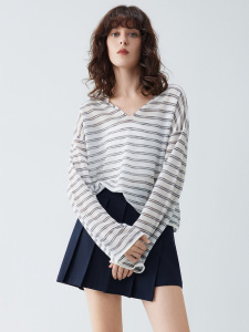 ELLE法式条纹V领休闲针织衫女2025秋新款套头轻薄设计感宽松上衣