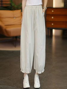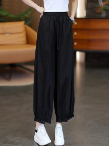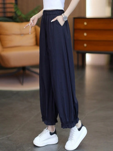 藏青色花苞裤女夏季薄款宽松大码休闲灯笼裤高腰木耳边花边九分裤