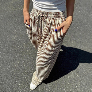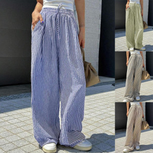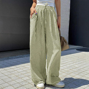2025欧美跨境亚马逊新款条纹宽腿裤抽绳口袋休闲长裤直筒裤女装
