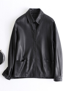 2025春秋新进口真皮植鞣绵羊皮女衬衫领短款休闲简约皮衣夹克外套