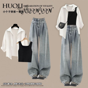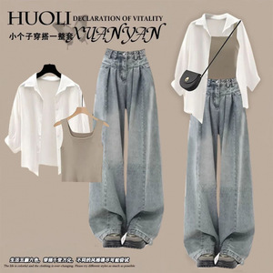 大码女装夏季套装女2025新款防晒衬衫背心收腰显瘦牛仔裤三件套潮