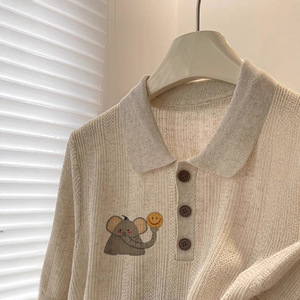 2025超火冰丝镂空针织燕麦色polo衫短款短袖女夏韩系减龄小象上衣