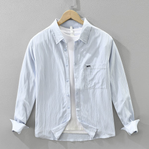 7778日系纯色刺绣长袖衬衫男士时尚百搭文艺休闲宽松上衣一件代发