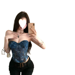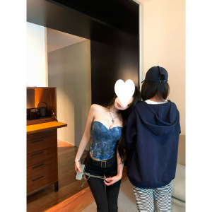 纯欲风美背抹胸背心女夏季鱼骨修身内搭蕾丝外穿蓝色短款打底上衣